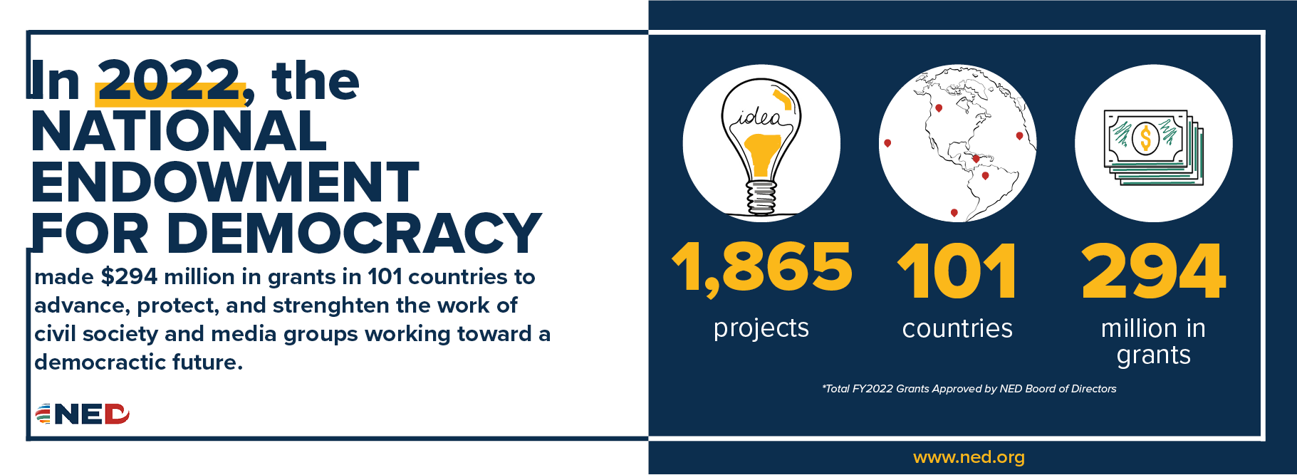 In 2022, the world witnessed Russia’s full-scale invasion of Ukraine, rising tensions in Asia, a power grab in Tunisia, conflict in Ethiopia, and increasing threats to freedom in many societies around the world. However, the National Endowment for Democracy finds many reasons to be optimistic. Citizens demonstrated in the streets of Iran, Cuba, Afghanistan, China, and Russia this year to demand their human dignity be respected. NED’s courageous partners continue their work to advocate for equal human rights, fair elections, an independent judiciary, free speech, a free press, and vibrant civil society in the world’s most repressive regimes.