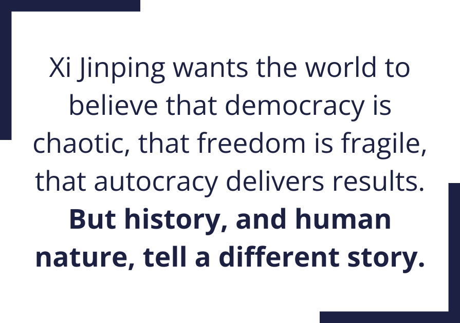 Xi Jinping wants the world to believe that democracy is chaotic, that freedom is fragile, that autocracy delivers results. But history, and human nature, tell a different story. Systems built on fear always project strength—until the day they don’t. They can control speech, but not thought. They can intimidate, but not inspire. And when those systems start to crack, it’s the networks we build now—the relationships among activists, policymakers, believers, workers, and advocates—that will help freedom rise faster.