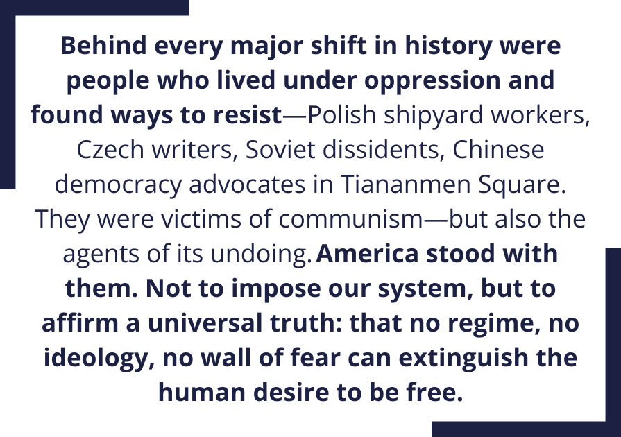 Above all, it took the efforts of the victims of communism, the people who lived under that oppressive system, the people who knew it the best, to be the real agents of change in their societies. Behind every major shift in history were people who lived under oppression and found ways to resist—Polish shipyard workers, Czech writers, Soviet dissidents, Chinese democracy advocates in Tiananmen Square. They were victims of communism—but also the agents of its undoing. America stood with them. Not to impose our system, but to affirm a universal truth: that no regime, no ideology, no wall of fear can extinguish the human desire to be free.