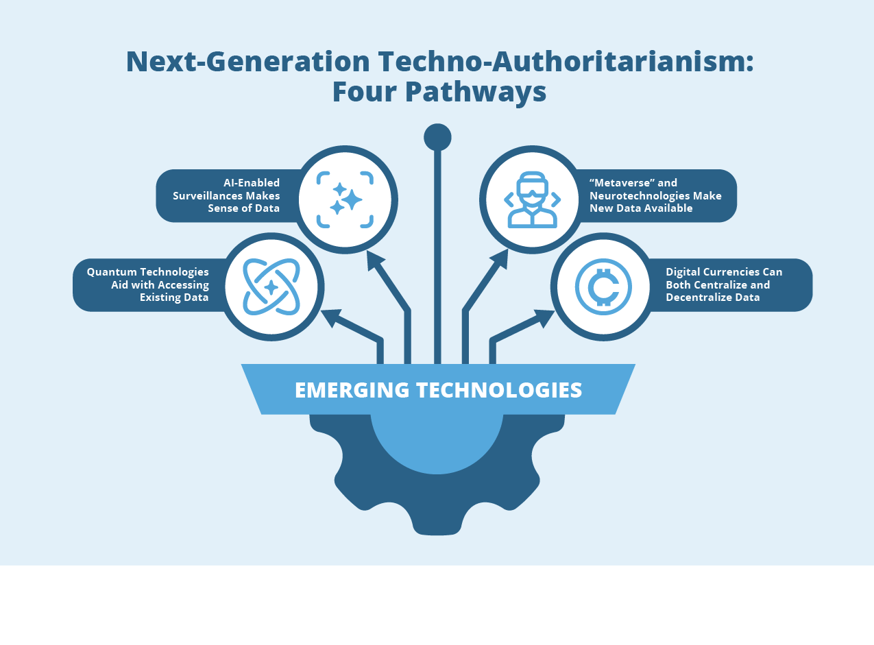 The field of emerging technologies is wide and evolving constantly. As a window on the future landscape, this report focuses on a selection of technologies that have drawn sustained interest from developers, figure prominently on the PRC agenda, and have clear relevance to data-centric authoritarianism. These focus areas are as follows: AI surveillance technologies; technologies that are changing mental privacy, particularly neurotechnologies and the immersive world and interfaces that make up the so-called metaverse; quantum computing with its potential to break present-day encryption; and digital currencies.