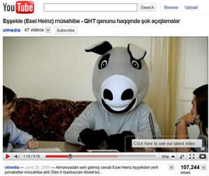 But the YouTube video featuring a mock “press conference” with a donkey that landed NED grantee Adnan Hajizade in jail can hardly be considered a moral threat or a foreign recruitment tool. Hajizade stars, swathed in a donkey costume, to mock a government debacle involving wildly overpriced donkeys imported from the EU. In the “press conference,” a “German” donkey describes his luxurious journey and warm welcome to the fabulous country of Azerbaijan. When a “journalist” questions the costs involved, the star proclaims that he is a “top-ranked donkey” and proves it by playing a violin for the amazed onlookers.