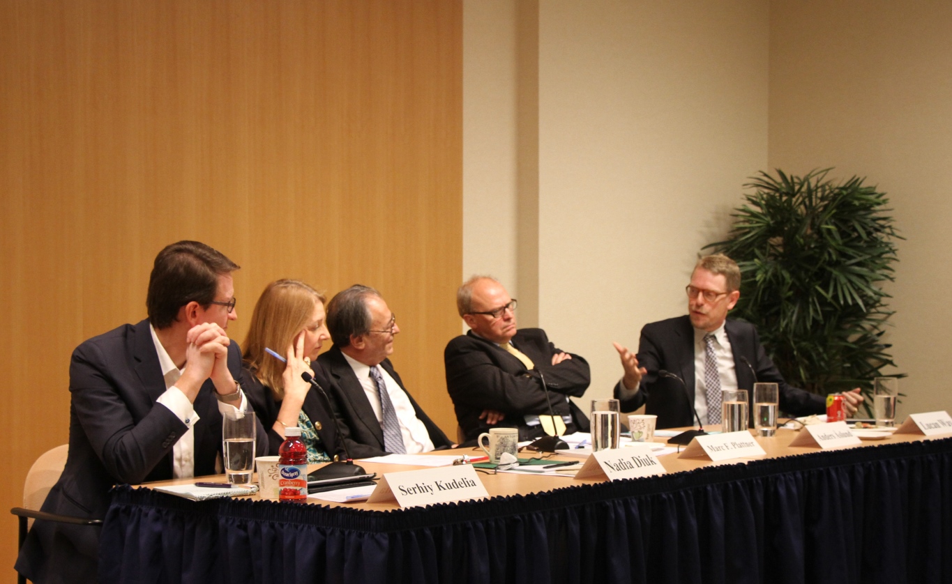The July 2014 issue of the Journal of Democracy features a cluster of eight articles on Ukraine. During the panel, four of the contributors elaborated on the subjects discussed in their articles. Serhiy Kudelia analyzed the evolution of Ukraine’s political system during the past four years and why it led to the downfall of President Viktor Yanukovych (2010-2014); Lucan Way assessed the role that civil society played in bringing down Yanukovych and the challenges that it will now face with Ukraine’s future as a country under threat; Anders Aslund examined the “endemic corruption” that has long plagued Ukraine and suggested how the new government can rebuild the country’s economy; and Nadia Diuk considered the longer-term significance of the Maidan Revolution—its impact on Ukraine’s evolving political culture and national identity and what this may mean for the country’s future democratic prospects.