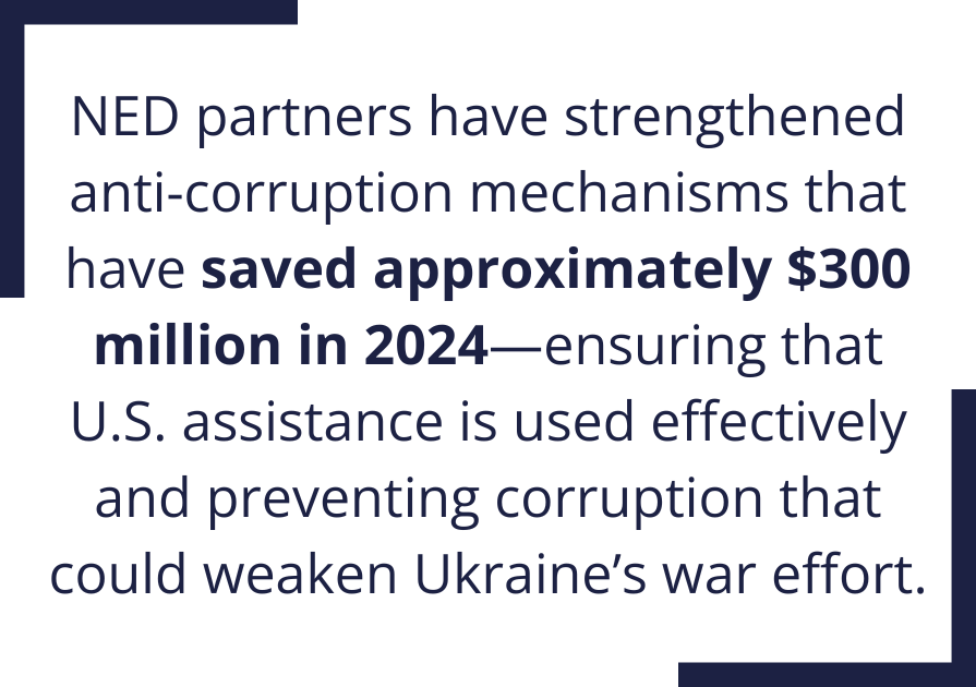 2. Increasing Transparency to Strengthen Ukraine as a Stable and Self-Reliant Partner: NED partners are exposing corruption and driving systemic reforms that strengthen Ukraine’s governance. Their work has led to the creation of independent anti-corruption institutions that have uncovered and prosecuted top corrupt officials and have dismantled networks that undermined state integrity. These successes have not only resulted in landmark legal actions, but have also helped institutionalize greater transparency and accountability.