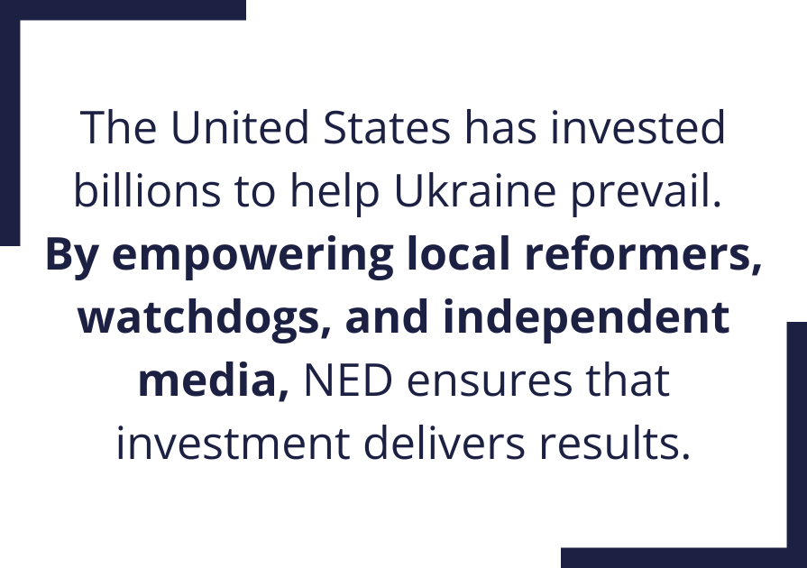 Today, that partnership matters more than ever. The United States has invested billions to help Ukraine prevail. By empowering local reformers, watchdogs, and independent media, NED ensures that investment delivers results: a Ukraine that can hold the line against authoritarian aggression, emerge stronger and freer, and contribute to a safer, more secure world for Americans and their allies.