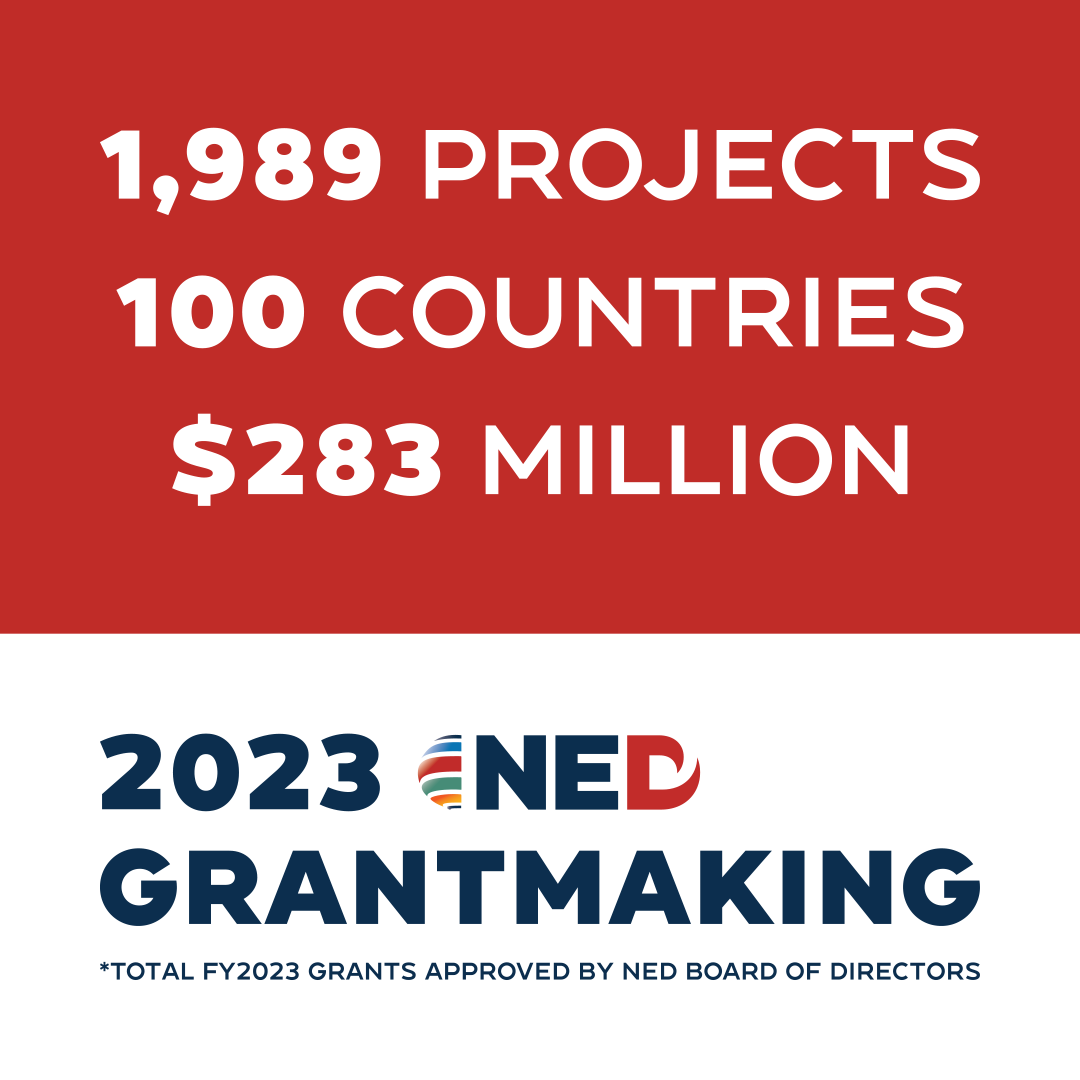NED continued to support partners who work for human rights, journalism, transparency, and justice, despite danger and sharpening repression. NED maintained strong support for the NED family core institutes including NDI, IRI, CIPE and the Solidarity Center. In 2023, NED’s Board of Directors approved $283 million for 1,989 projects in 100 countries. In its 40th anniversary year, NED demonstrated how it is building on its legacy to adapt for the future.