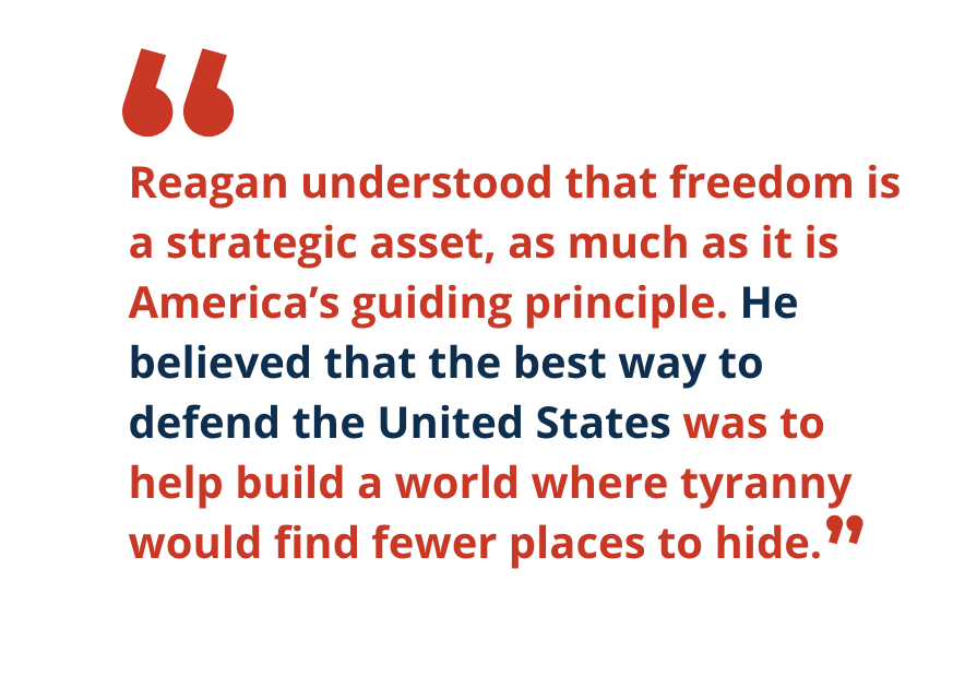 Reagan understood that freedom is a strategic asset, as much as it is America’s guiding principle. He believed that the best way to defend the United States was to help build a world where tyranny would find fewer places to hide.