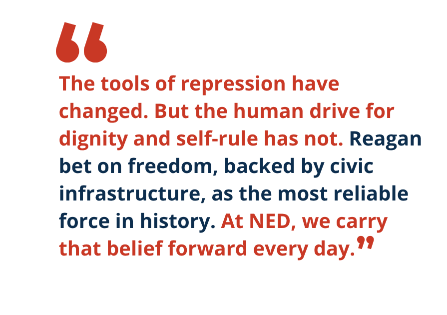 The tools of repression have changed. But the human drive for dignity and self-rule has not. Reagan bet on freedom, backed by civic infrastructure, as the most reliable force in history. At NED, we carry that belief forward every day.