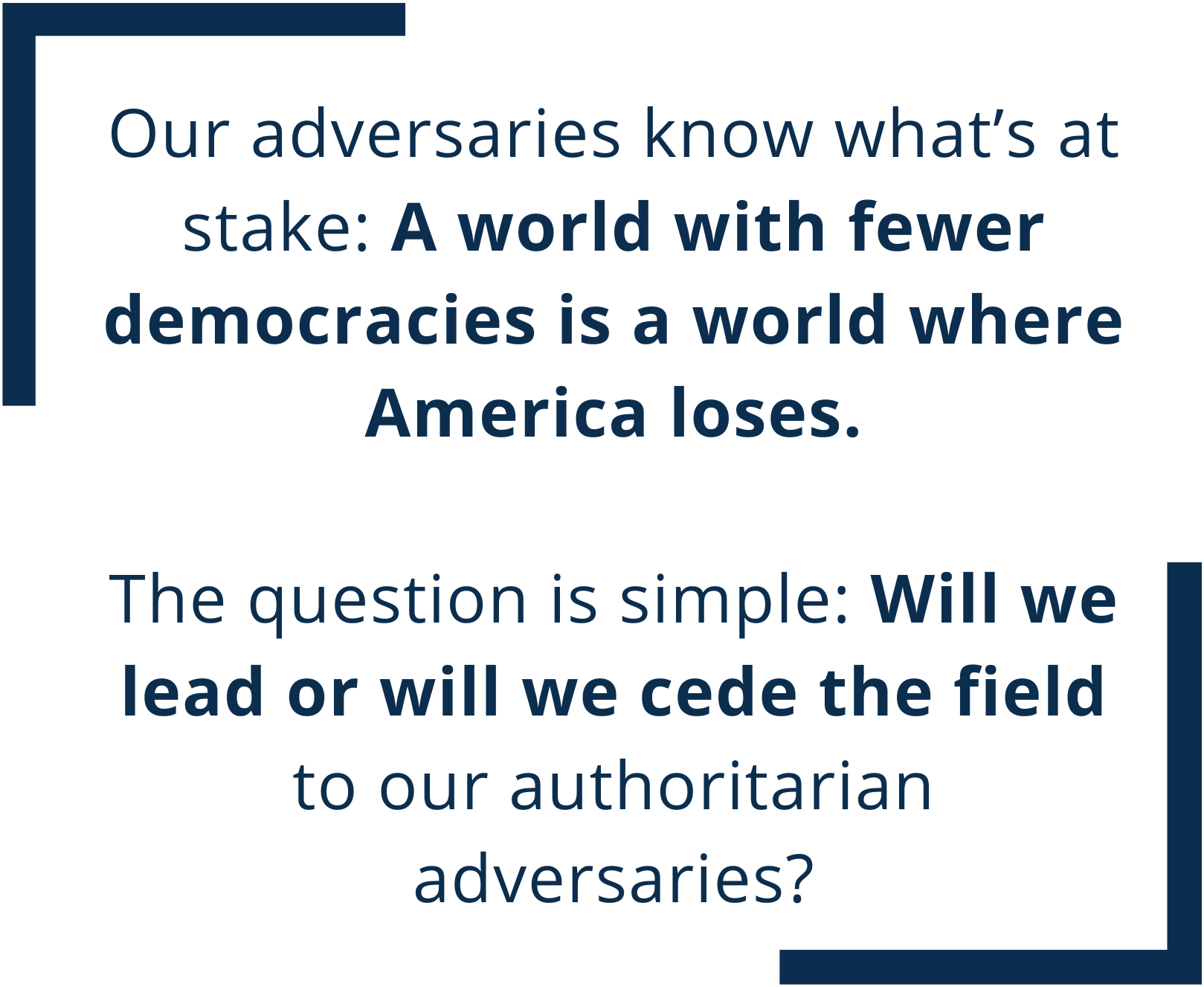 Our adversaries know what’s at stake: A world with fewer democracies is a world where America loses. The question is simple: Will we lead or will we cede the field to our authoritarian adversaries?