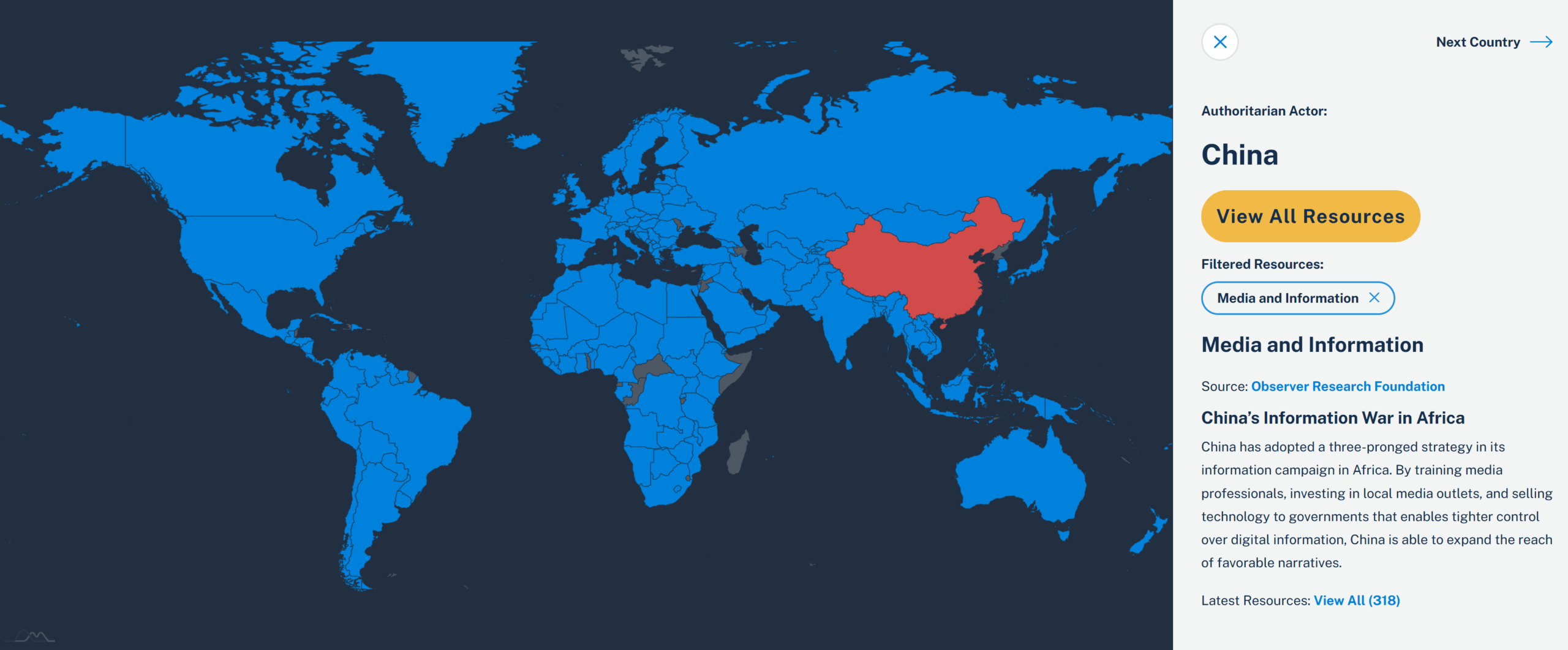 An example of a search for resources on PRC media and information manipulation on the Forum’s Sharp Power Research Portal.