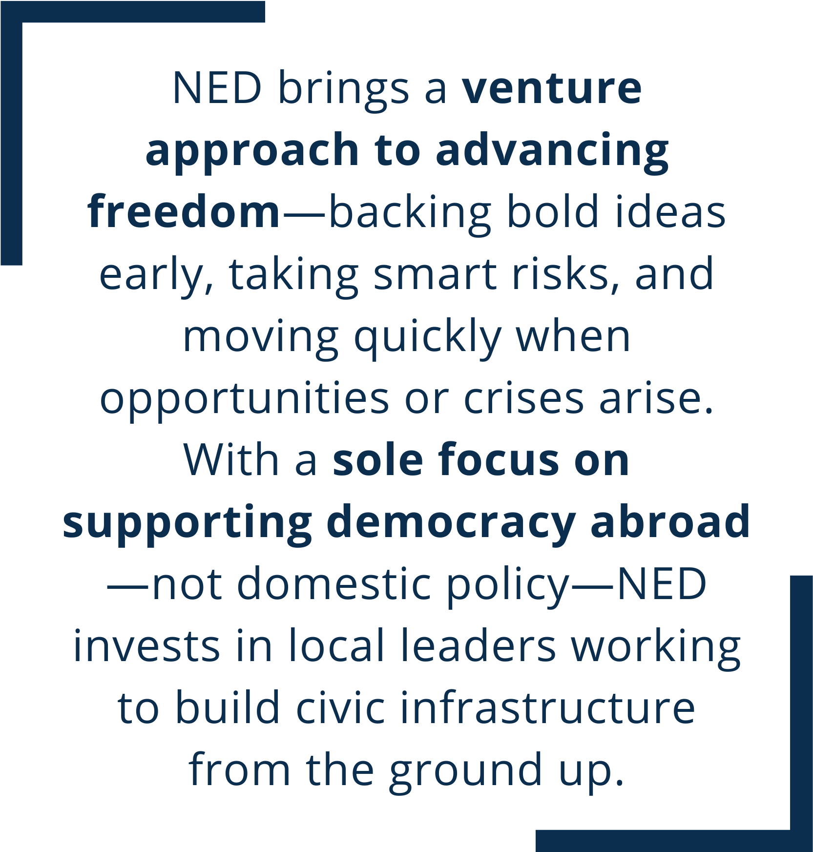 NED brings a venture approach to advancing freedom—backing bold ideas early, taking smart risks, and moving quickly when opportunities or crises arise. With a sole focus on supporting democracy abroad—not domestic policy—NED invests in local leaders working to build civic infrastructure from the ground up.