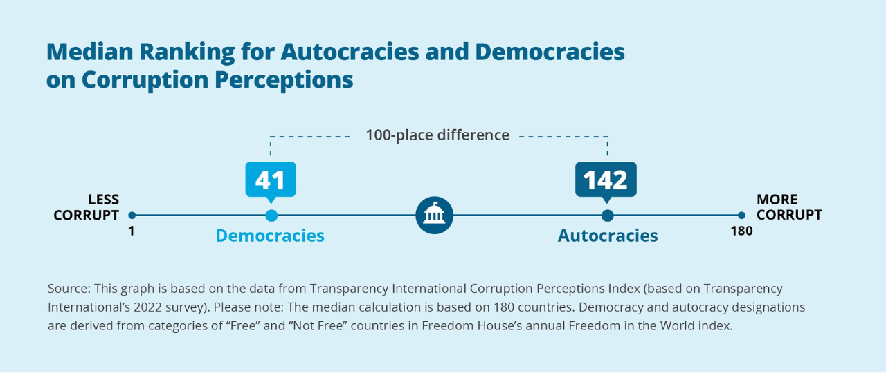 Public corruption is a viscerally emotive topic for any society, representing a betrayal of citizens’ interests by those entrusted with public resources. This is one of the reasons that corruption features so prominently in authoritarians’ antidemocratic narratives. Yet the openness of democracies makes them institutionally better suited to expose and address corruption—a key argument to be made in countering authoritarian narratives. The median ranking for countries with authoritarian governments on Transparency International’s annual Corruption Perceptions Index is 142 out of 180 countries, while the median ranking for democracies is 41—a full one hundred-place difference. 52 The performance gap has direct implications for social welfare, a vibrant private sector, and public trust.